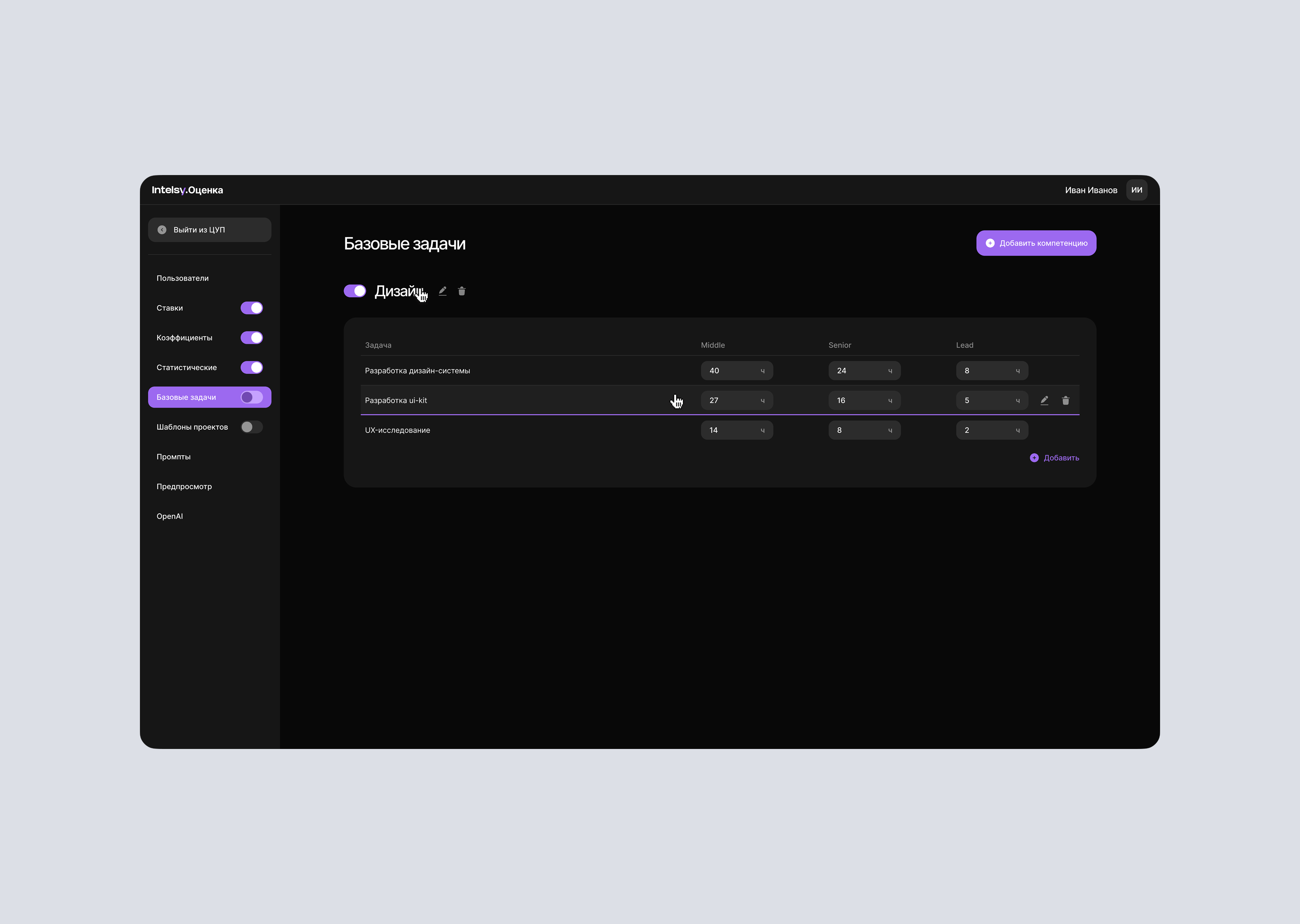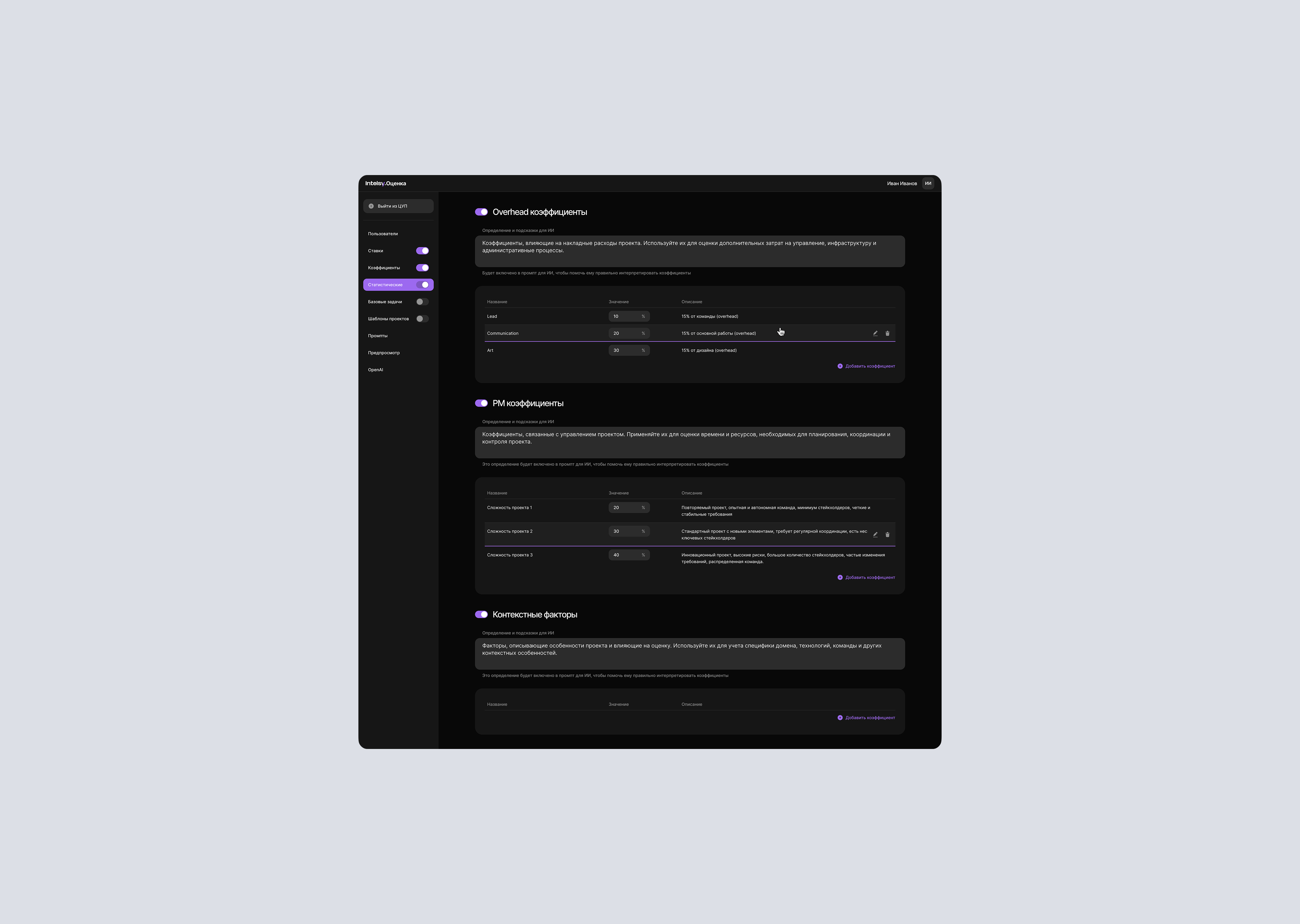 Разработал систему, которая автоматически разбирает входящий бриф на задачи и рассчитывает трудозатраты и стоимость по параметрической модели (ставки, переменные, коэффициенты). Используется ИИ-модуль для декомпозиции и формирования первичных оценок.